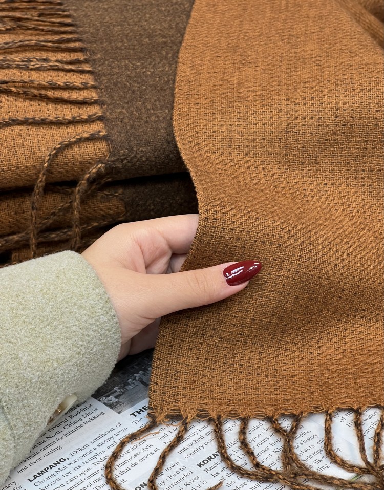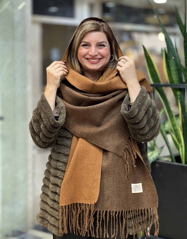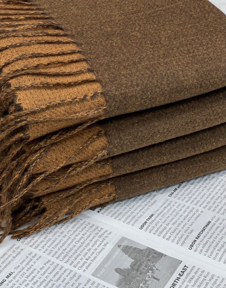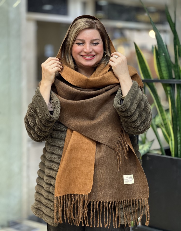 شال موهر دورو رنگ قهوه ای و شتری ریشه فیتیله ایی وارداتی کیفیت درجه یک قابل استفاده به صورت شال و شالگردن از هر دو سمت.