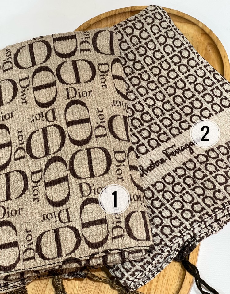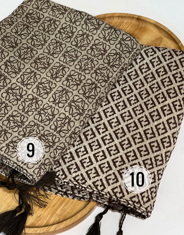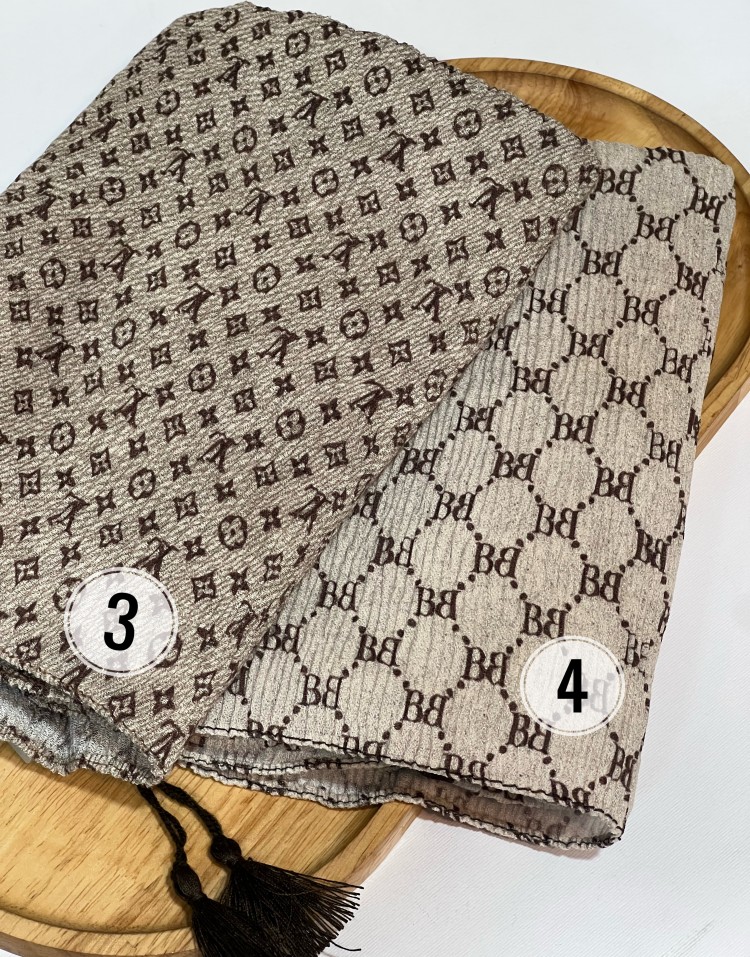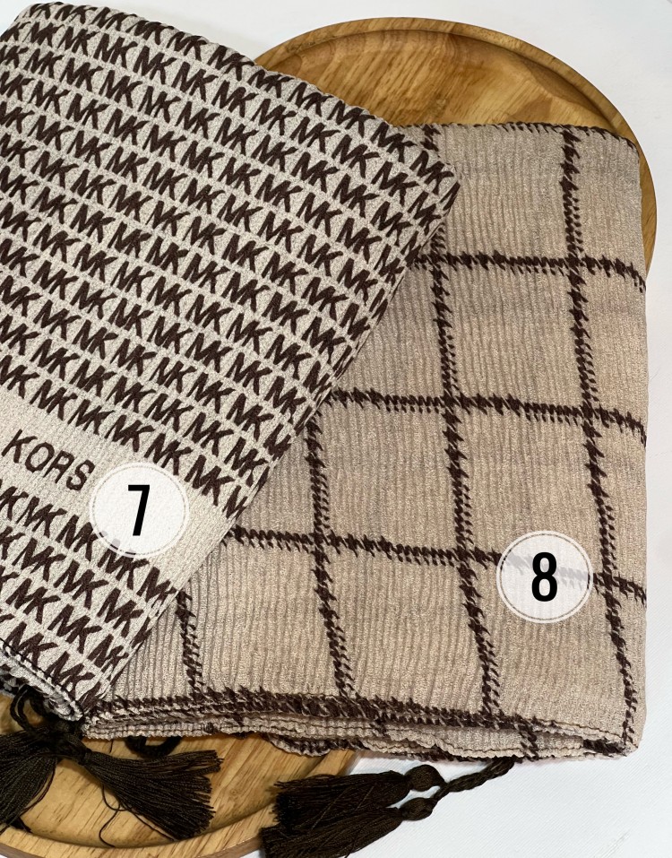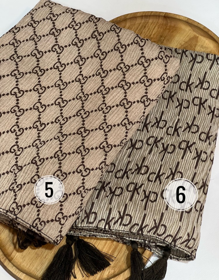 شال پلیسه رنگ کرم قهوه ای طرح مارک کیفیت درجه یک ایستایی روی سر عالی مناسب استایل های مختلف